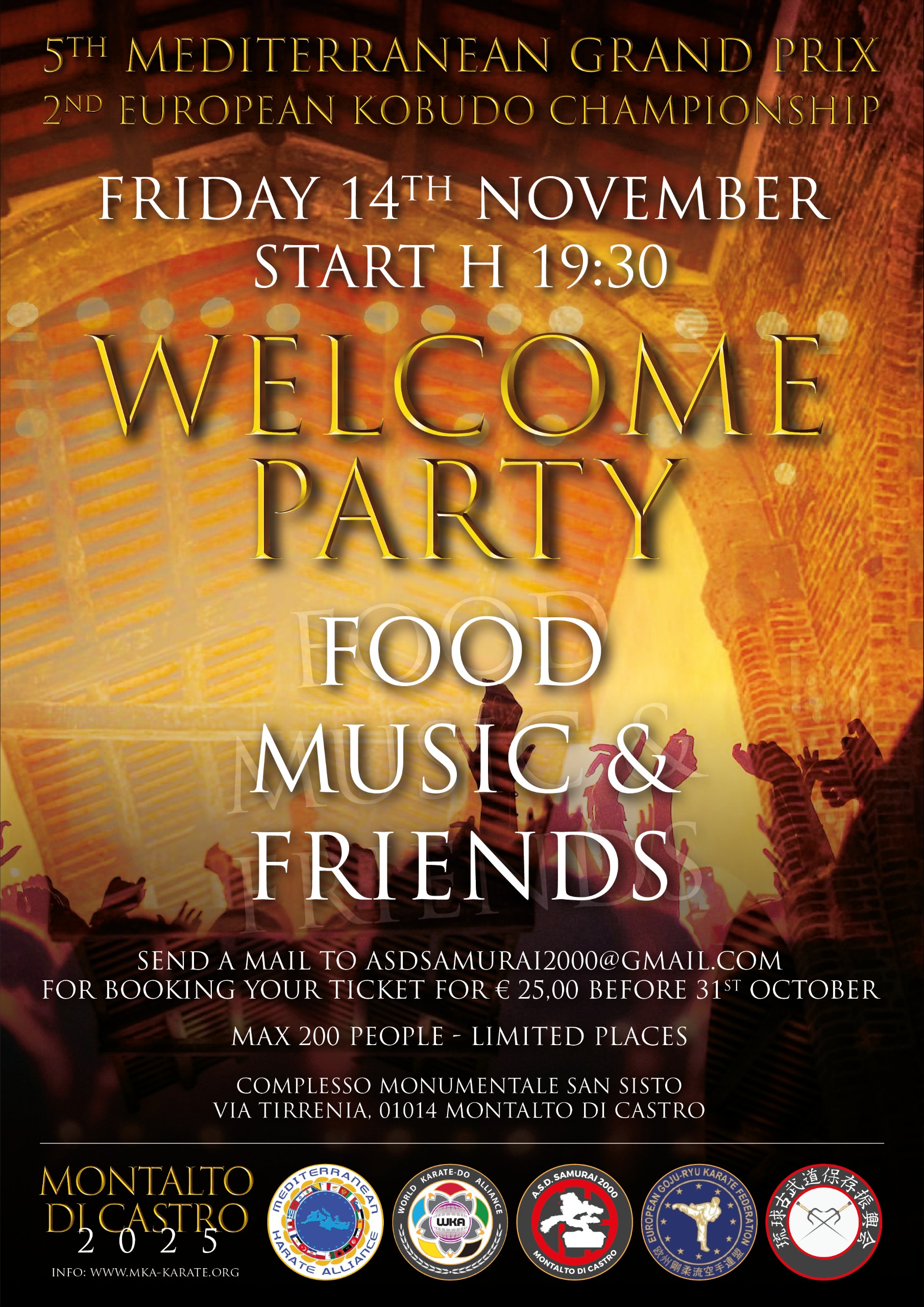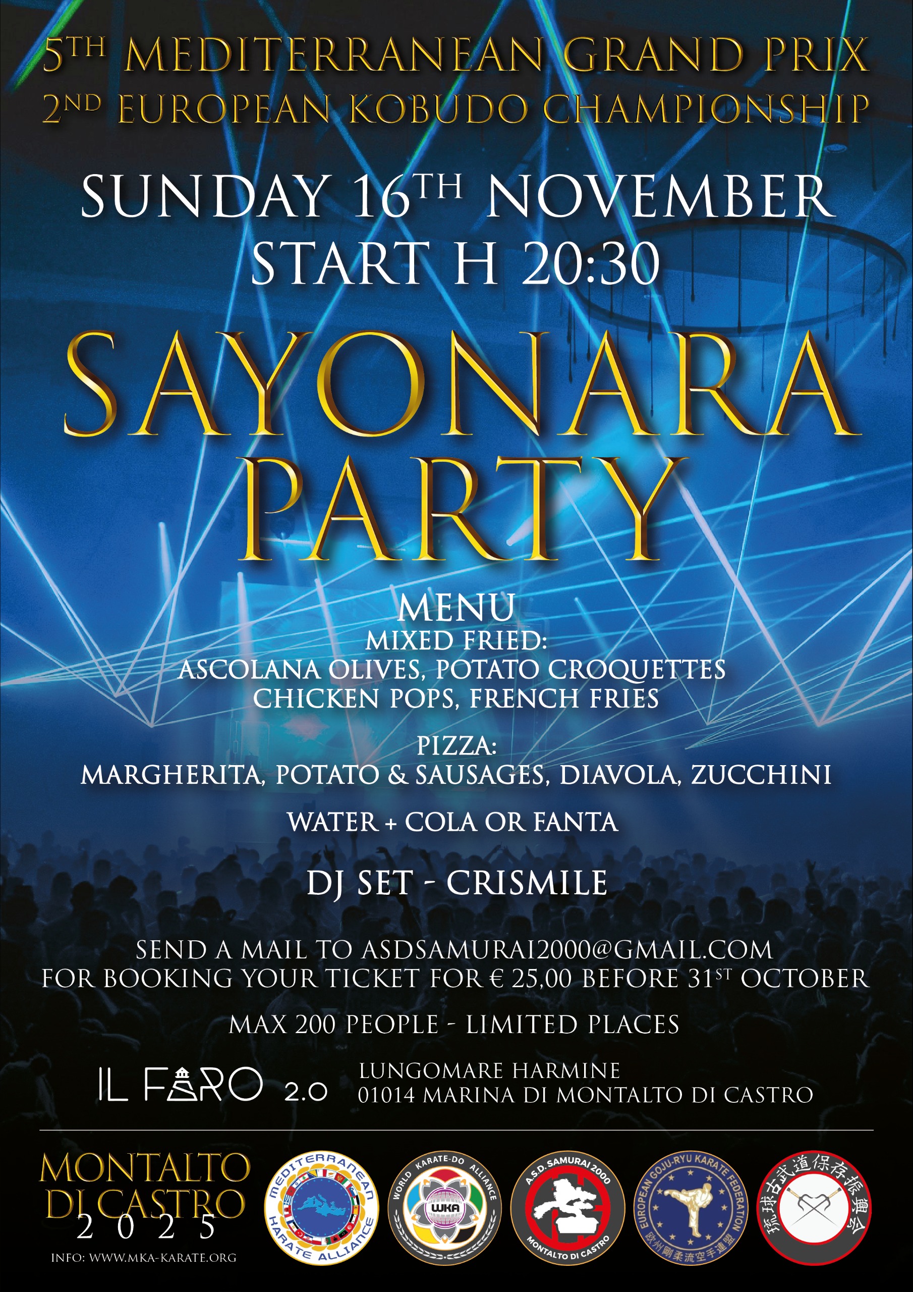 WELCOME & SAYONARA PARTIES Please note that the Welcome and Sayonara Parties are organised by the HOST ORGANISER and NOT MKA. Kindly contact SAMURAI 2000 - Mo Gianni Ottoni.